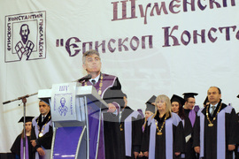 На снимката: Шумен (7 декември 2018) На тържествена церемония, абсолвентите от Шуменския университет "Епископ Константин Преславски" получиха своите дипломи. Слово произнася ректорът на университета проф. Георги Колев.