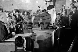 На снимката: София (29 септември 1952) Подсъдимият Камен Вичев на подсъдимата скамейка по време на процеса срещу католическата заговорническа организация в България в Съдебната палата в София. Снимка: Рачо Стоянов/Архив БТА