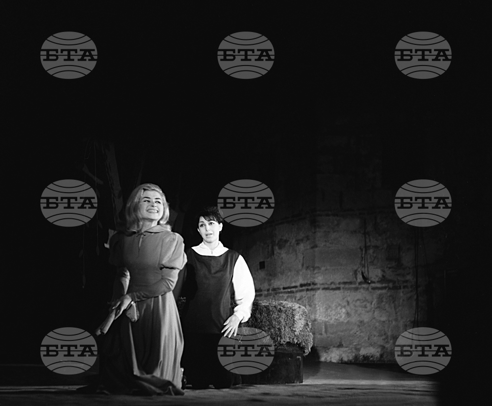 На снимката: (5 юли 1964) Надя Топалова в ролята на Селия и Гинка Станчева в ролята на Розалинда в комедията „Както ви се харесва“. Снимка: Симеон Ненов/Архив БТА