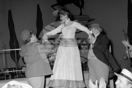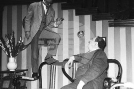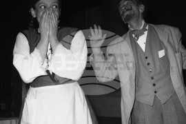 София (31 януари 1965) Премиера в Народния театър „Иван Вазов“ на комедията в две действия „Службогонци“ от Иван Вазов. Постановка на Филип Филипов. Асистент-режисьор Любен Морчев. Режисьор-педагог - Константин Кисимов. Декори и костюми - Стефан Савов. Композитор - Симеон Пиронков. Постановка на танците - Фео Мустакова. Карикатурите в програмата са дело на Теню Пиндарев. На снимката: Любен Калинов в ролята на Станчо Квасников, Милка Магнева в ролята на баба Дона и Виолета Бахчеванова в ролята на Терзийска. Пресфото-БТА, снимка: Виолета Попова/архив
