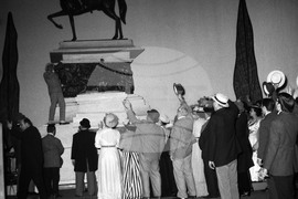 София (31 януари 1965) Премиера в Народния театър „Иван Вазов“ на комедията в две действия „Службогонци“ от Иван Вазов. Постановка на Филип Филипов. Асистент-режисьор Любен Морчев. Режисьор-педагог - Константин Кисимов. Декори и костюми - Стефан Савов. Композитор - Симеон Пиронков. Постановка на танците - Фео Мустакова. Карикатурите в програмата са дело на Теню Пиндарев. На снимката: Сцена в кафенето. Пресфото-БТА, снимка: Виолета Попова/архив