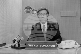 На снимката: София (28 февруари 1974) Телетипна зала на БТА. Петко Бочаров в телевизионното студио.