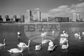 Бургас (15 март 1985) Необичайно студената зима през тази година предизвика появата на гости от северните части на Европа. Вниманието привличат лебедите - с необикновено големия за страната брой, с красотата си и с доверчивостта си към хората. На снимката: Зимуващи лебеди във водоема край ж.к. "Изгрев" в град Бургас.