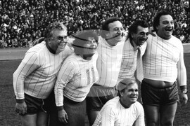 На снимката: София (28 март 1984) Футболен спектакъл по повод Световния ден на театъра. В турнира между столичните театри се наложи Театърът „Българска армия“, а в срещата реванш между отборите на българските артисти и журналисти победа с 2:1 постигнаха артистите.