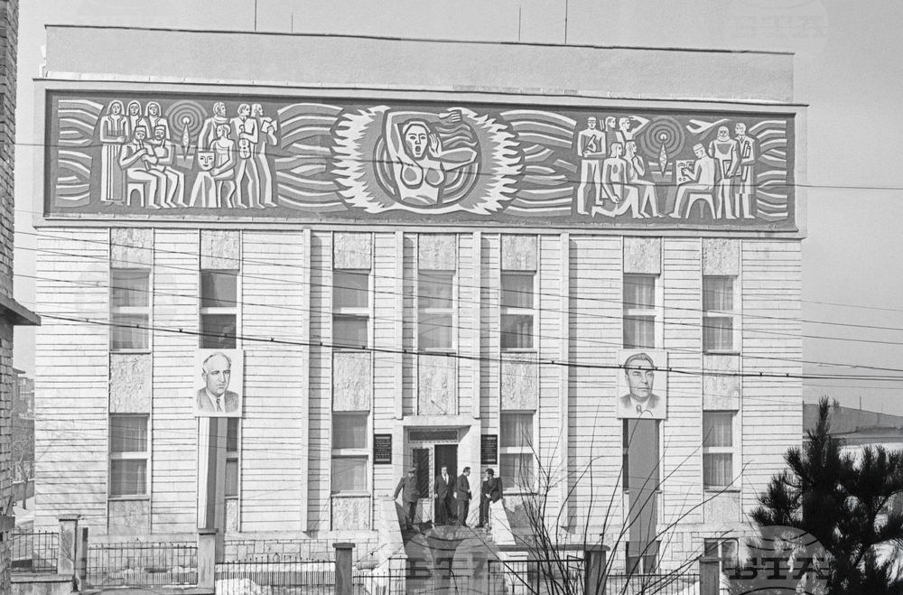 На снимката: Шумен (2 февруари 1973) Откриване на новата сграда на радио Шумен с уникалното ръчно редено архитектурно пано.