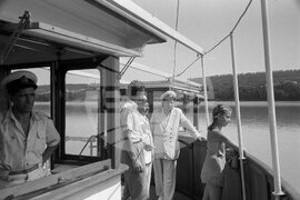 На снимката: река Дунав (17 август 1953) Пътници в дружески разговор с капитана на пътническия речен кораб „Георги Димитров“. Пресфото-БТА, снимка: Георги Викентиев/архив (ПГ)