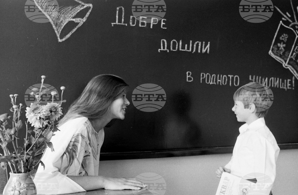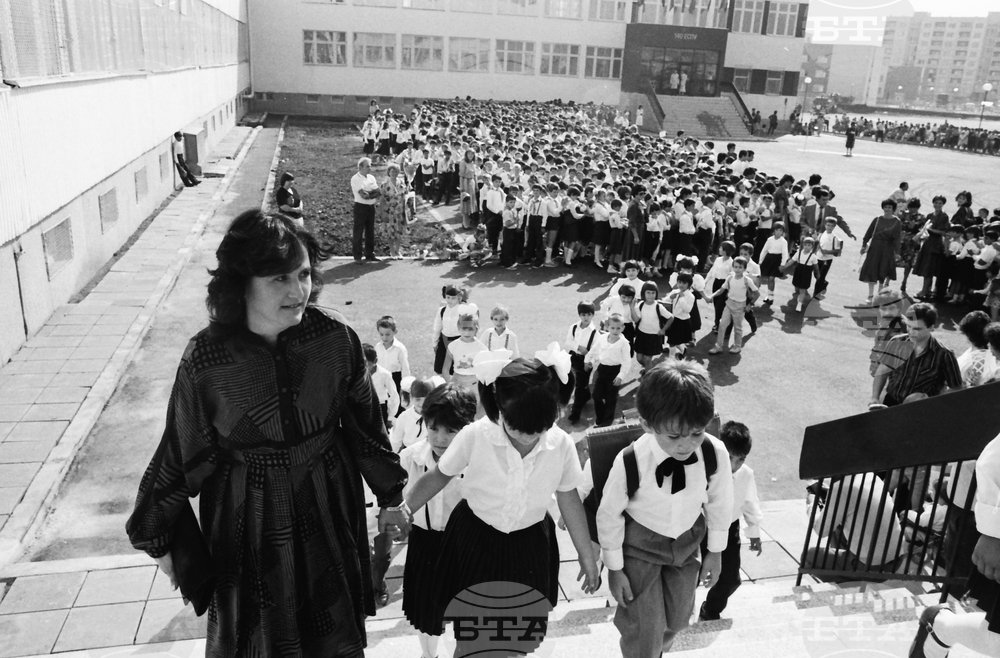 София (15 септември 1987) Първият учебен ден за най-малките в новото училище в столичния жилищен комплекс „Обеля”. На снимката: посрещане в новото 140 ЕСПУ.
