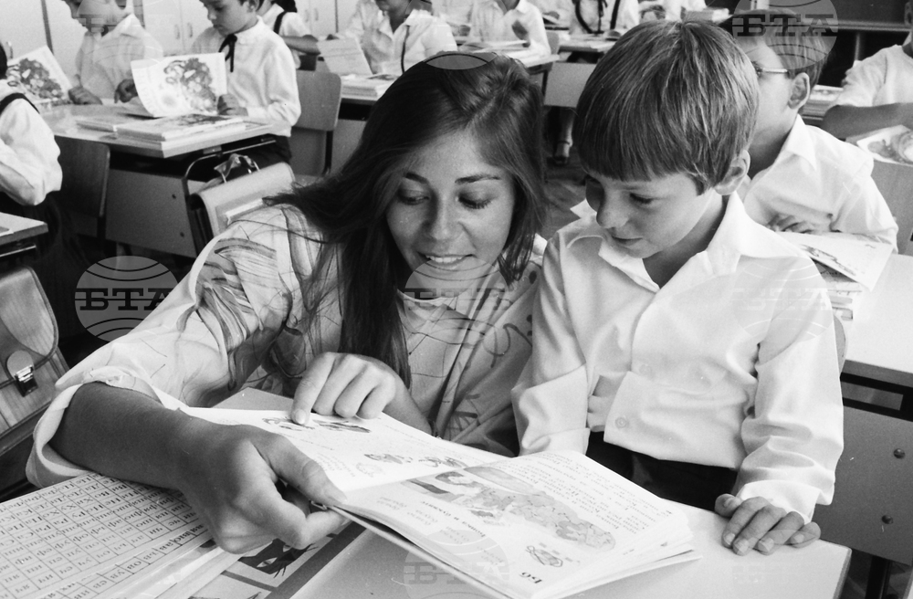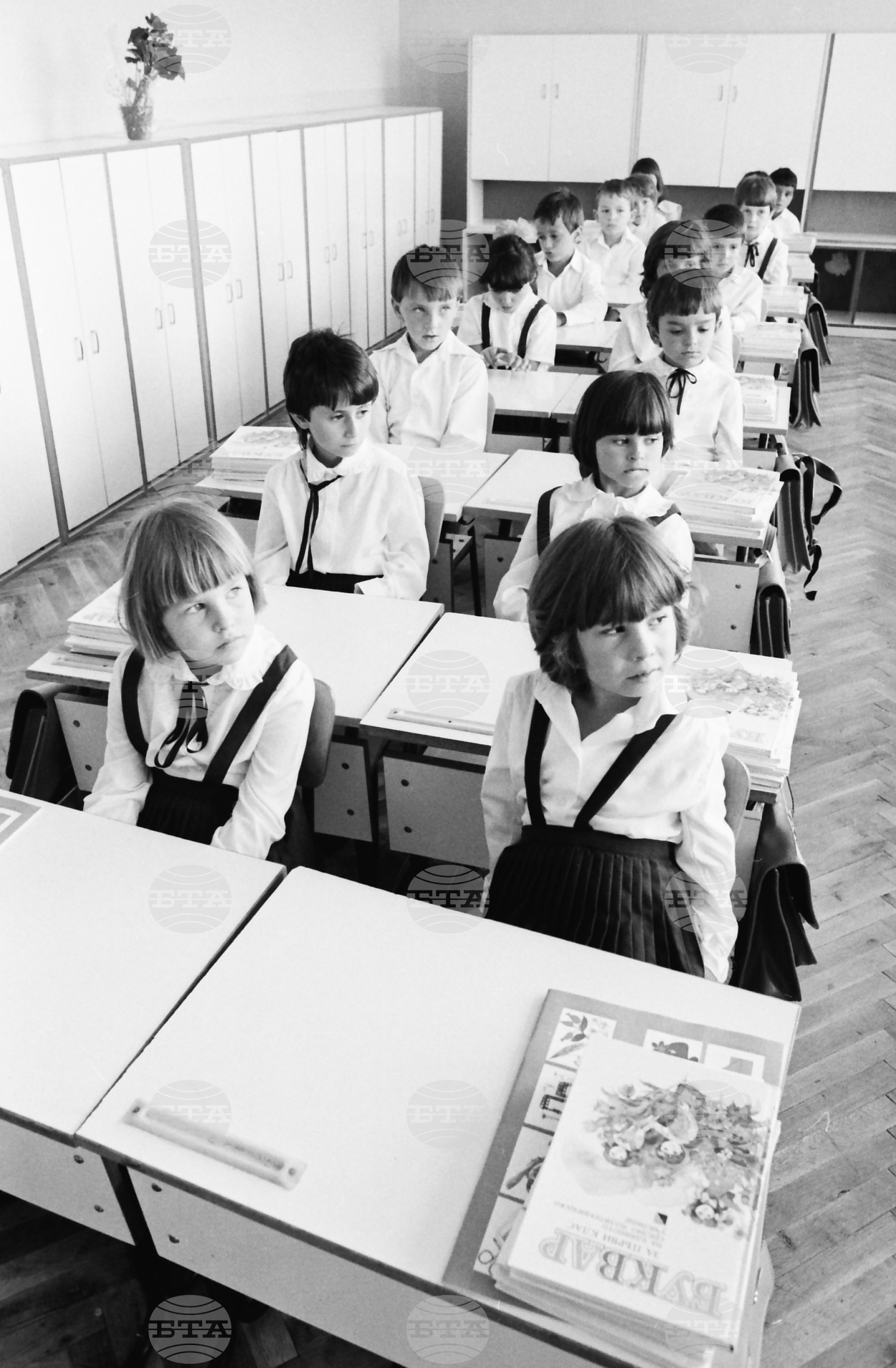 София (15 септември 1987) Първият учебен ден за най-малките в новото училище в столичния жилищен комплекс „Обеля”. На снимката: първи мигове в класната стая.