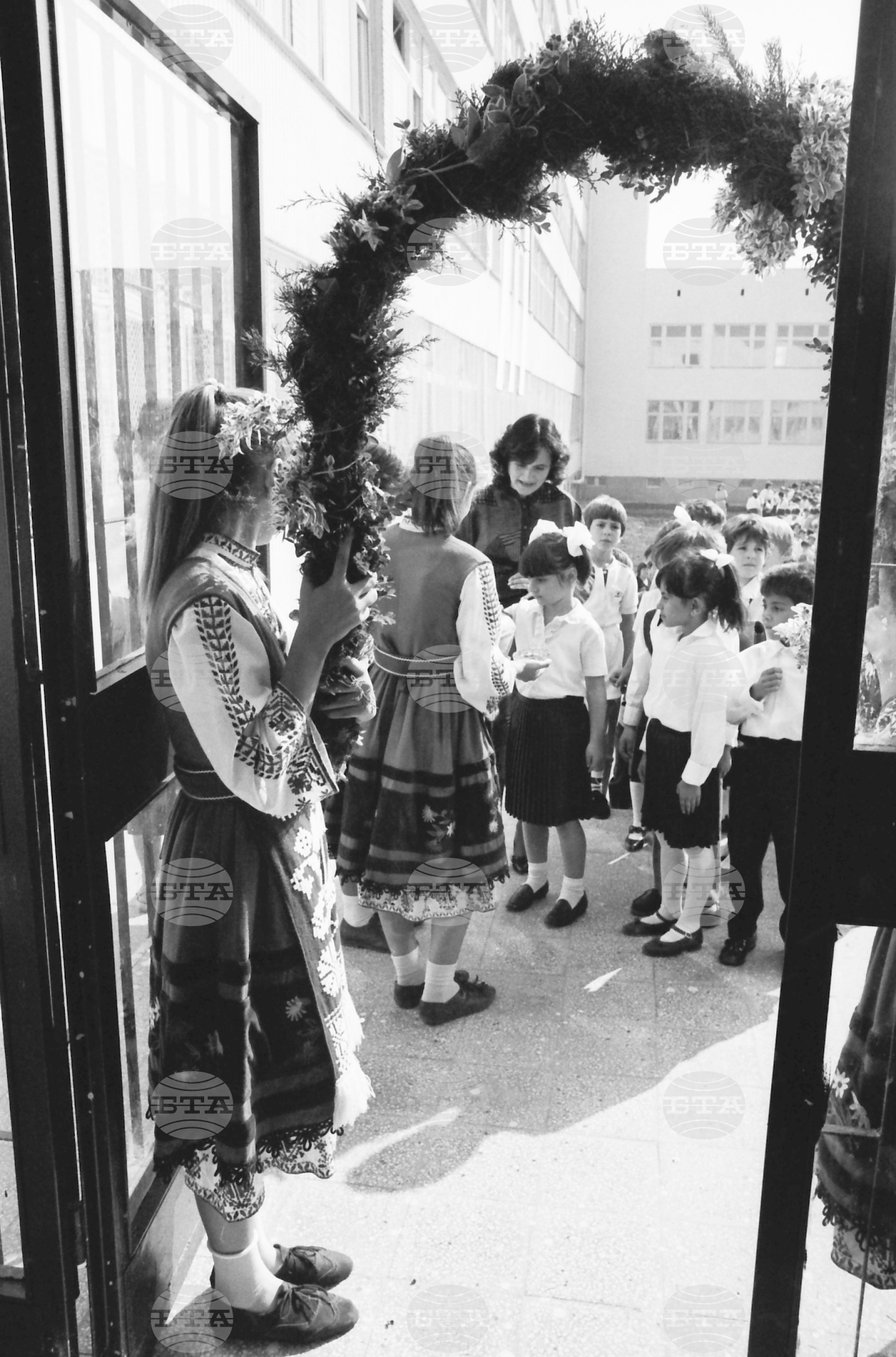 София (15 септември 1987) Първият учебен ден за най-малките в новото училище в столичния жилищен комплекс „Обеля”. На снимката: посрещане на първокласници в новото 140 ЕСПУ.