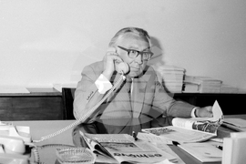На снимката: София (26 май 1979) Главният директор на Българската телеграфна агенция Лозан Стрелков в работния си кабинет. Пресфото-БТА снимка: Божидар Тодоров/архив