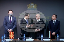 София (10 февруари 2022) В сградата на МРРБ се състоя заседание на междуведомствената работна група между България и Северна Македония за сътрудничество в областите инфраструктура, транспорт и свързаност. На снимката от ляво надясно: министърът на местното самоуправление на Република Северна Македония Горан Милевски, министрът на транспорта и съобщенията на Република Северна Македония - Благой Бочварски и министрът на транспорта и съобщенията на България - Николай Събев. Пресфото - БТА снимка: Минко Чернев (ПБ)