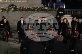 София (3 март 2022) Президентът и върховен главнокомандващ на Въоръжените сили Румен Радев участва в тържествената програма, с която се отбелязва Националният празник на България 3 март. Тържествената заря-проверка се състоя на пл. "Народно събрание" в столицата. Президентът Румен Радев прие почетния строй на представителните части на Българската армия. На снимката от ляво надясно: Никола Минчев - председател на НС, президентът Румен Радев, Кирил Петков - министър-председател и Илияна Йотова - вицепрезидент.