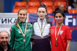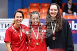 София (29 януари 2023) Националният шампионат по лека атлетика за мъже и жени в зала се провежда в зала "Асикс Арена". На снимката: награждаване в дисциплината бягане 200 м. - жени - Дева-Мария Драгиева (злато), Виктория Георгиева (сребро) и Андреа Савова (бронз).