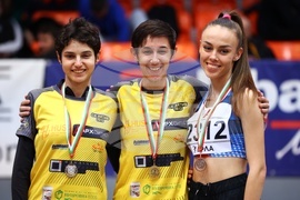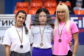 София (29 януари 2023) Националният шампионат по лека атлетика за мъже и жени в зала се провежда в зала "Асикс Арена". На снимката: награждаване в дисциплината 60 м. препятствено бягане - жени - Никол Андонова (злато), Ива Александрова (сребро) и Василена Антонова (бронз).