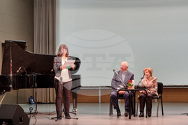 Габрово (5 февруари 2023) Със спектакъл в зала „Възраждане“ в Габрово бе представена новата книга на Милка Пурел „Какво даде Габрово и България на света“. Представянето започна с думи на Владилена Катевска, учител от Национална Априловска гимназия, а авторката Пурел бе представена от проф. Михаил Харалампиев, който написва и предговорът на книгата. На снимката: София Ботева от музикалното сдружение при Народно читалище „Априлов-Палаузов“ Габрово.