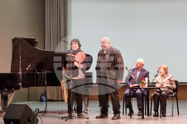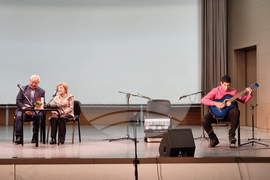 Габрово (5 февруари 2023) Със спектакъл в зала „Възраждане“ в Габрово бе представена новата книга на Милка Пурел „Какво даде Габрово и България на света“. Представянето започна с думи на Владилена Катевска, учител от Национална Априловска гимназия, а авторката Пурел бе представена от проф. Михаил Харалампиев, който написва и предговорът на книгата. На снимката: Борислав Кържин (вдясно), изпълнител на акордеон.