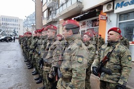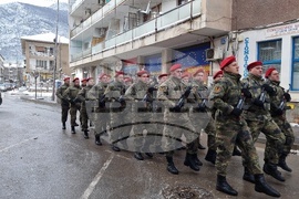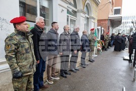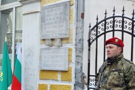 Враца (6 февруари 2023) С военни почести днес във Враца бе открита паметна плоча на генерал Кирил Ботев. Паметният знак е поставен на фасадата на къща „Иванка Ботева“. В тържественото откриване се включиха членове на инициативния комитет по изграждането на плочата, заместник-кметът на Враца Александър Владимиров, военнослужещи от Военно формирование 54 990, духовият оркестър към НЧ „Развитие – 1869“, граждани. Плочата бе осветена от митрополит Григорий в съслужие с врачански свещеници. На снимката: военнослужещи от Военно формирование 54 990. Пресфото - БТА снимка: Мая Ценова (ЕД)