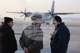 София (8 февруари 2023) От Летище Враждебна отлетя самолет „Спартан" със служители на Главна дирекция „Пожарна безопасност и защита на населението" - 16-а транспортна авиационна група, за да окажат помощ на пострадалите от земетресението в Турция. На снимката: Командирът на 16-а авиобаза полк. Филип Ангелов (в средата) и директорът на ГДПБЗН Главен комисар Александър Джартов (дясно).