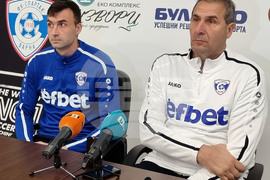 Варна (9 февруари 2023) Треньорът на Спартак 1918 Варна Димитър Димитров (вдясно) и футболистът Александър Цветков (вляво) дадоха пресконференция преди предстоящата среща на отбора от 19-ия кръг на efbet Лигата срещу Лудогорец, която ще се играе в събота.