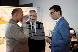 София (9 февруари 2023) България е домакин на международен форум за зелена енергия, част от кампанията "Да! На българската зелена икономика". Форумът "Бизнес и власт - заедно за чиста енергия" се провежда в хотел "Хаят Риджънси София". На снимката: Росен Христов (вляво) - министър на енергетиката, Николай Шушков, заместник-министър на регионалното развитие и благоустройството, Венко Сабрутев (вдясно) ПП "Продължаваме промяната".