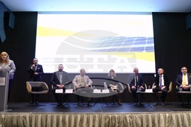 София (9 февруари 2023) България е домакин на международен форум за зелена енергия, част от кампанията "Да! На българската зелена икономика". Форумът "Бизнес и власт - заедно за чиста енергия" се провежда в хотел "Хаят Риджънси София". На снимката: Славка Бозукова (вляво), журналист, главен редактор на „Стандарт”, Максим Бехар (втори от ляво), журналист, бизнесмен, дипломат и PR експерт, Росен Христов (четвърти от ляво) - министър на енергетиката, Росица Карамфилова (четвърта от дясно) - министър на околната среда и водите, Николай Шушков (трети от дясно), заместник-министър на регионалното развитие и благоустройството, Цветан Симеонов (втори от дясно) - председател на Българската търговско-промишлена палата, проф. д.т.н. инж. Николай Вълканов (вдясно) - председател на Българска минно-геоложка камара.
