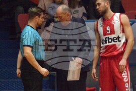 Варна (12 февруари 2023) В зала „Христо Борисов" във Варна се играе срещата от 21-ия кръг на Националната баскетболна лига (НБЛ) между отборите на Черно море Тича и ЦСКА. На снимката: Росен Барчовски (в средата), треньор на ЦСКА.