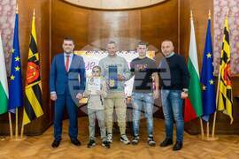 Перник (15 февруари 2023) Призьорите от 29-ия Международен фестивал на маскарадните игри „Сурва" в Перник получиха наградите си на специална церемония, състояла се в тържествената зала в Минната дирекция. В тазгодишния фестивал, който се проведе в края на януари, взеха участие над 10 000 носители на маскарадната традиция от България, а броят на чуждестранните групи беше 15. Голямата награда на фестивала „Златна маска" беше присъдена на сурвакарите от Батановци и кукерската формация при Народно читалище „Умение 2003 г." от Ямбол. На снимката: Стефан Кръстев (ляво)- заместник-кмет на Община Перник и представители на кукерската формация при Народно читалище „Умение 2003 г." от Ямбол, завоювали отличието „Златната маска".