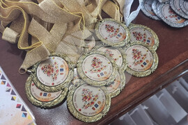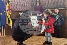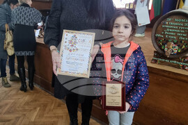 Перник (15 февруари 2023) Призьорите от 29-ия Международен фестивал на маскарадните игри „Сурва" в Перник получиха наградите си на специална церемония, състояла се в тържествената зала в Минната дирекция. В тазгодишния фестивал, който се проведе в края на януари, взеха участие над 10 000 носители на маскарадната традиция от България, а броят на чуждестранните групи беше 15. Голямата награда на фестивала „Златна маска" беше присъдена на сурвакарите от Батановци и кукерската формация при Народно читалище „Умение 2003 г." от Ямбол. На снимката: Награда за малък участник получи Никол Миленкова.