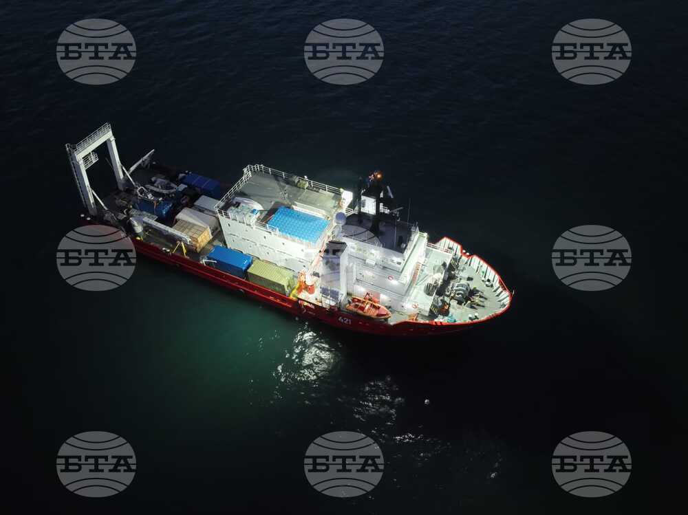 Остров Дисепшън (20 февруари 2023) Българският военен научноизследователски кораб "Св. св. Кирил и Методий" (НИК 421), осигуряващ 31-вата българска антарктическа експедиция, вдигна котва от вътрешния залив на остров Дисепшън в 08:00 часа местно време на 20 февруари и се отправи обратно към българската полярна база "Св. Климент Охридски" на съседния остров Ливингстън. Това е вторият преход до Дисепшън, който НИК 421 извърши в рамките на само няколко дни, за да разтовари и остатъка от материалната част за испанската станция "Габриел де Кастия". Снимка направена с дрон. Снимка: Константин Карагьозов/ БТА (ЕД)
