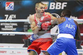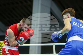 София (22 февруари 2023) В зала "София" се провежда 74-ото издание на Международния турнир по бокс за Купа „Странджа“. На снимката: Кирил Русинов (червена фланелка) в категория до 63.5 килограма и австралиеца Макс Маклъри.