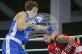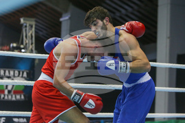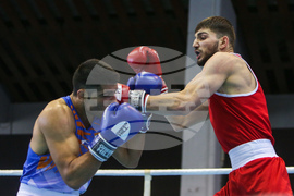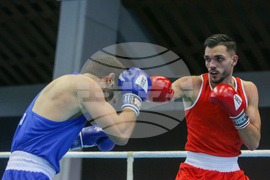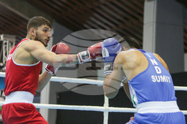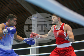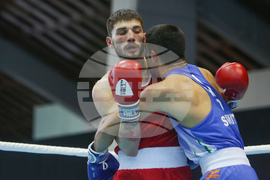 София (22 февруари 2023) В зала "София" се провежда 74-ото издание на Международния турнир по бокс за Купа „Странджа“. На снимката: Уилиам Чолов (червена фланелка)(75 кг) срещу Вахтан Харутюнян (Армения).