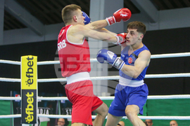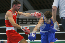 София (22 февруари 2023) В зала "София" се провежда 74-ото издание на Международния турнир по бокс за Купа „Странджа“. На снимката: Категория до 63,5 килограма. Световният вицешампион Керем Йозмен от Турция (в синьо) в действие срещу сърбина Алексей Сендрик.