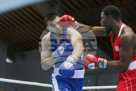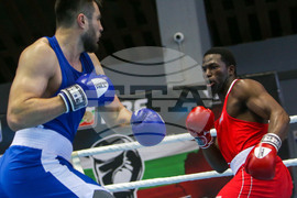 София (22 февруари 2023) В зала "София" се провежда 74-ото издание на Международния турнир по бокс за Купа „Странджа“. На снимката: В тежка категория (+92 кг) Йордан Морехон срещу Мохамад Абдулаев (Азербайджан) в син екип.