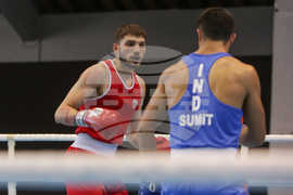София (22 февруари 2023) В зала "София" се провежда 74-ото издание на Международния турнир по бокс за Купа „Странджа“. На снимката: В категория 75 кг Рами Киуан (България) срещу Киван Сумит (Индия) в син екип.