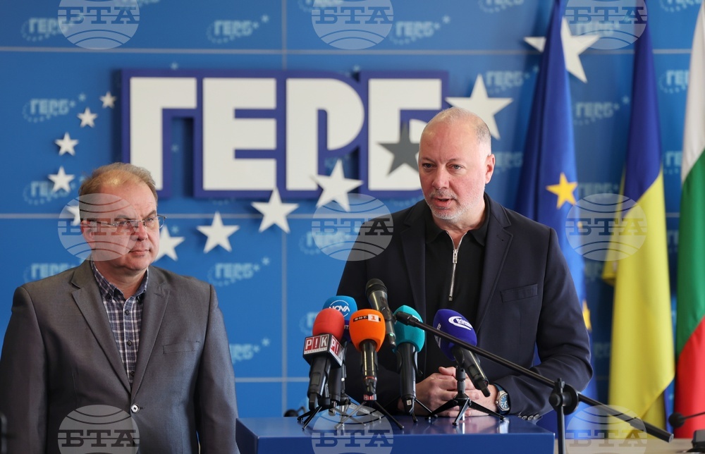 София (22 февруари 2023) Представители на ПП "ГЕРБ" дадоха изявление в централата на партията. На снимката: Радомир Чолаков (ляво) и Росен Желязков. Снимка: Владимир Шоков / БТА