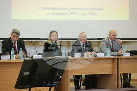 София (22 февруари 2023) Национално съвещание на МВР се провежда в сградата на Главна дирекция "Национална полиция“. На него присъстват политическото и професионалното ръководство на МВР, директорите на главни дирекции, ОДМВР и СДВР, както и на административните структури в министерството. По време на съвещанието се обсъждат резултатите от дейността на МВР по превенция и противодействие на престъпността, състоянието на пътнотранспортния травматизъм през 2022 г., организацията на дейността на структурите на МВР в периода на подготовката и провеждането на избори за 49-то Народно събрание. На снимката (от ляво надясно): Петър Тодоров, главен секретар на Министерството на вътрешните работи, Моника Димитрова-Бийчър, заместник-министър на вътрешните работи, Емил Ганчев, заместник-министър на вътрешните работи, Венцислав Катинов, заместник-министър на вътрешните работи.
