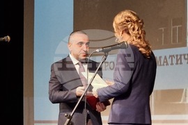 Перник (24 февруари 2023) Вицепрезидентът Илияна Йотова бе сред специалните гости на 100-годишния юбилей на Природо-математическа гимназия "Христо Смирненски" в Перник. Във връзка с честването тя връчи на директора на учебното заведение Емилия Грозданова почетния знак на президента на Република България Румен Радев. Снимка: Милен Миланов / БТА