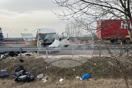 Чирпан (25 февруари 2023) Нелегален мигрант от Афганистан e загинал при катастрофа рано тази сутрин на автомагистрала „Тракия“ в района на Чирпан. Това потвърди за БТА окръжният прокурор на Стара Загора Дичо Атанасов. Той каза, че инцидентът е станал на 165-и километър около 5:00 часа. По първоначална информация товарен бус е превозвал нелегални мигранти. В катастрофиралия бус е имало 46 мигранти. Снимка: Павлина Дудева / БТА (ЕД)
