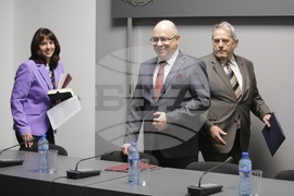 София (28 февруари 2023) В Министерство на труда и социалната политика вицепремиерът и министър на труда и социалната политика Лазар Лазаров дава пресконференция. На снимката (от ляво надясно): Заместник-министърът на труда и социалната политика Наталия Ефремова, вицепремиерът и министър на труда и социалната политика Лазар Лазаров и заместник-министърът на труда и социалната политика Емил Мингов. Снимка: Христо Касабов / БТА (ЕД)
