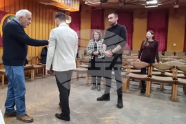 Благоевград (28 февруари 2023) Камерна опера – Благоевград представя премиерно тази вечер „Бастиен и Бастиена“ – третата създадена опера от Волфганг Амадеус Моцарт, когато великият композитор е бил само на 12 години. Постановката е на младия режисьор Теодор Георгиев (дясно). Финалните репетиции на премиерния спектакъл проследи създателят на Камерна опера – Благоевград акад. Пламен Карталов. В спектакъла участват Калин Душков, Венера Мелеки (втора от ляво) и Пламен Кумпиков. Диригент е Красимир Топалов. На снимката: директорът на Софийската опера и балет акад. Пламен Карталов (втори от дясно).