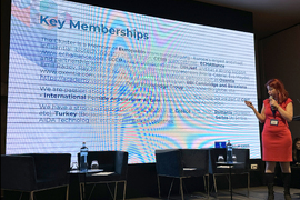 Барселона (1 март 2023) В Хотел “Catalonia Barcelona Plaza”, Plaça Espanya се провежда Международен бизнес и инвестиционен форум „България: инвестиционна дестинация“, организиран от Българската агенция за инвестиции (БАИ). На снимката: председателят на управителния съвет на Биотехнологичен и здравен клъстер (Биоклъстер) и член на управителния съвет на клъстер "Изкуствен интелект" Кристина Ескенази.