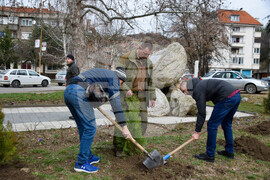 Благоевград (1 март 2023) Горски служители и журналисти залесиха района около паметната плоча на майор Орлински в Благоевград в навечерието на 3 март. Инициативата е на Югозападно държавно предприятие и горското стопанство в Благоевград. Около паметната плоча, поставена на мястото, където на 12 февруари 1878 г. е посрещнат IV Мариополски полк, предвождан от майор Иван Павлович Орлински, днес бяха засадени млади фиданки. Снимка: Красимир Николов/БТА (ЕД)
