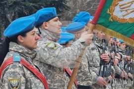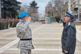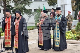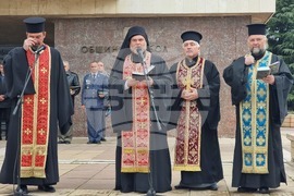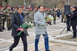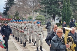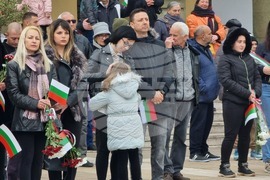 Ямбол (3 март 2023) Ямбол отбеляза 145 години от Освобождението на България от османско иго с тържествена общоградска церемония. Честването започна на площада пред Общината с ритуал по издигане на националния флаг, тържествен строй на военнослужещи, слово на кмета и благодарствен молебен. От площада потегли шествие с военнослужещи, граждани, представители на местната и държавна власт. Пред Паметника на героите беше отслужена заупокойна молитва и бяха поднесени венци и цветя. На снимката: Венец поднася Петър Чобанов (дясно).