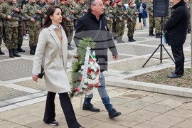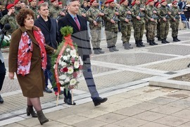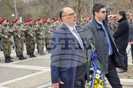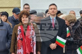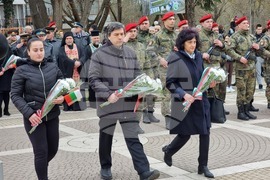 Ямбол (3 март 2023) Ямбол отбеляза 145 години от Освобождението на България от османско иго с тържествена общоградска церемония. Честването започна на площада пред Общината с ритуал по издигане на националния флаг, тържествен строй на военнослужещи, слово на кмета и благодарствен молебен. От площада потегли шествие с военнослужещи, граждани, представители на местната и държавна власт. Пред Паметника на героите беше отслужена заупокойна молитва и бяха поднесени венци и цветя. На снимката: Венец поднася Кристиан Вигенин.