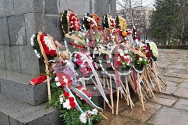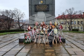 Кърджали (3 март 2023) С шествие на представителните блокове на учебните заведения в Кърджали бе дадено началото на тържествената програма, посветена на националния празник на България – 3 март. Честването продължи пред Паметника на Освободителите в Градската градина, където бяха поднесени венци и цветя, а кметът инж. Хасан Азис отправи приветствие към гражданите. На снимката (от ляво надясно): Кметът на Кърджали инж. Хасан Азис, районният мюфтия Басри Еминефенди, отец Петър Гарена и учителят Байрам Юсеин. Снимка: Валентина Стоева /БТА (ЕД)