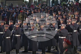 София (3 март 2023) На площад „Народно събрание“ пред Паметника на Цар Освободител се провежда тържествена заря-проверка по повод на националния празник Трети март. На снимката: Присъстващите коленичиха и отдадоха почит с минута мълчание. Снимка: Владимир Шоков/БТА (ЕД)