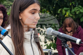 Варна (10 март 2023) Пред Паметника на благодарността във Варна бе отбелязана 80-годишнината от спасяването на българските евреи. В отбелязването на годишнината, организирано от Регионалната организация на евреите „Шалом“ в града, се включиха граждани, потомци на спасени евреи и бяха наградени призьорите от ученически конкурс за есе и рисунка на тема „Памет. Толерантност. Единение." На снимката: Ученичката от 10-ти клас на Морската гимназия във Варна Десислава Станчева, призьор в конкурса за рисунка.