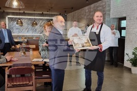Габрово (11 март 2023) Министърът на туризма Илин Димитров откри първото по рода си кулинарно състезание в Габрово. Проявата е посветена на 60-годишнината от откриването на Професионалната гимназия по туризъм „Пенчо Семов“ (ПГТ „Пенчо Семов“). В надпреварата ученици от ПГТ „Пенчо Семов“, ще готвят в отбори с директори на различни институции в Габрово. На снимката: министър Илин Димитров (дясно) връчва грамота от министерството на туризма на директора Радослав Стоянов.