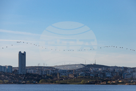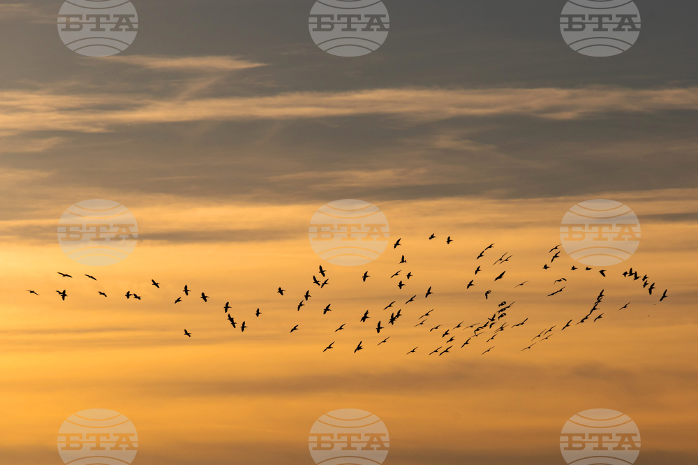 Бургас (15 март 2023) Полет на ято Розови пеликани (Pelecanus onocrotalus). Птиците прелитат над Бургас, квартал "Меден Рудник" и Мандренско езеро. Розовият пеликан е изключително рядък за България вид. Включен е в "Червената книга". Снимка: Христо Стефанов/БТА (ЕД)