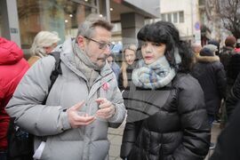 София (16 март 2023) "Движение за култура" организира шествие в столицата. Участниците в проявата настояват за адекватно законодателство за творческите институции и за оставката на директора на Народния театър "Иван Вазов" Васил Василев. На снимката: проф. дфн Георги Каприев (вляво) и Лилия Абаджиева.